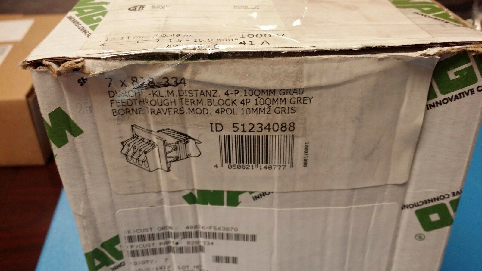 (1 PC) 828-334 WAGO 4 Position 6 AWG Feed-Through Terminal Block
