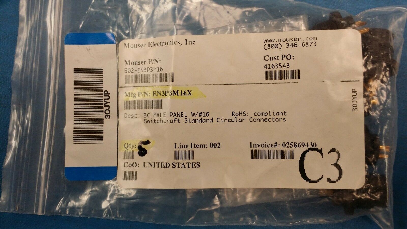 (1 PC) EN3P3M16X SWITCHCRAFT CONN RCPT MALE 3POS SOLDER CUP ROHS