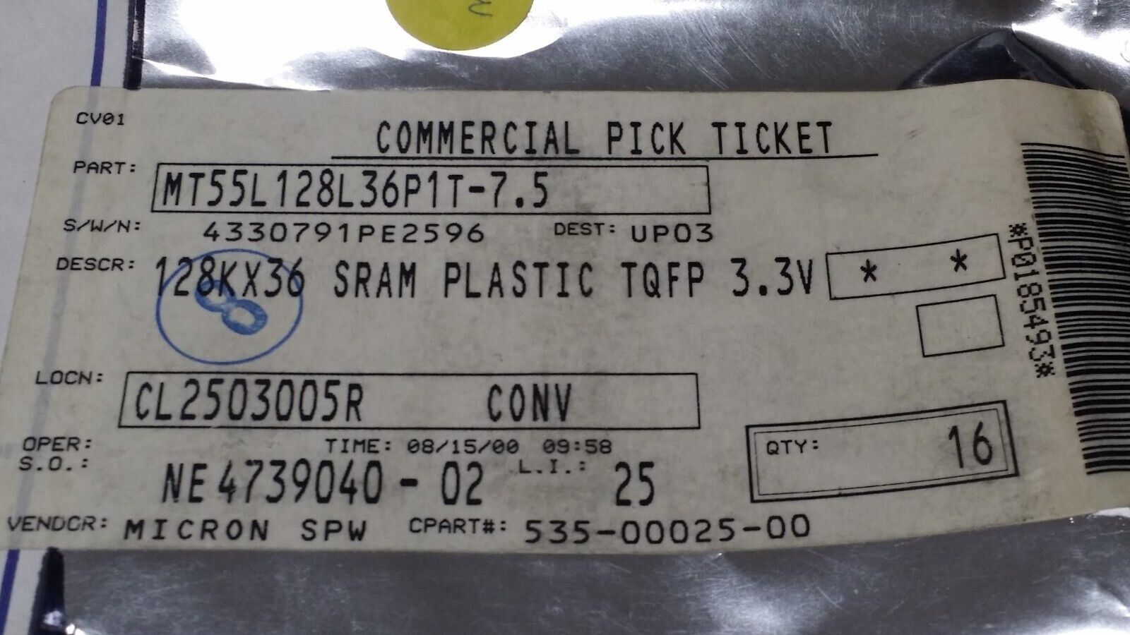(1 PC) MT55L128L36P1T-7.5 MICRON ZBT SRAM, 128KX36, 4.2ns, CMOS, PQFP100