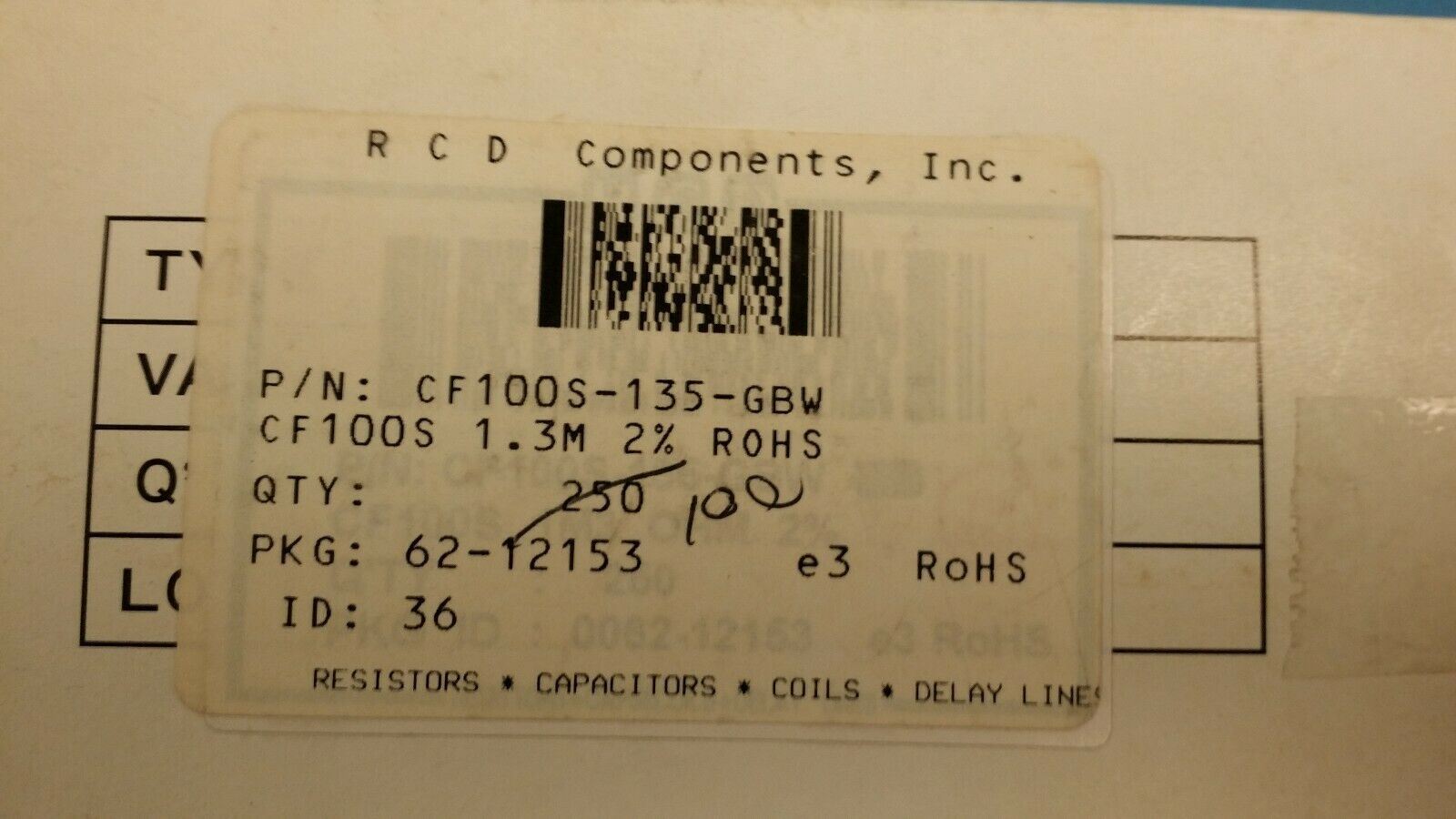 THIS LISTING IS FOR (10 PCS) CF100S-135-GBW RCD Fixed Resistor Carbon Film 1W 1.3M Ohm 400V 2% ROHS