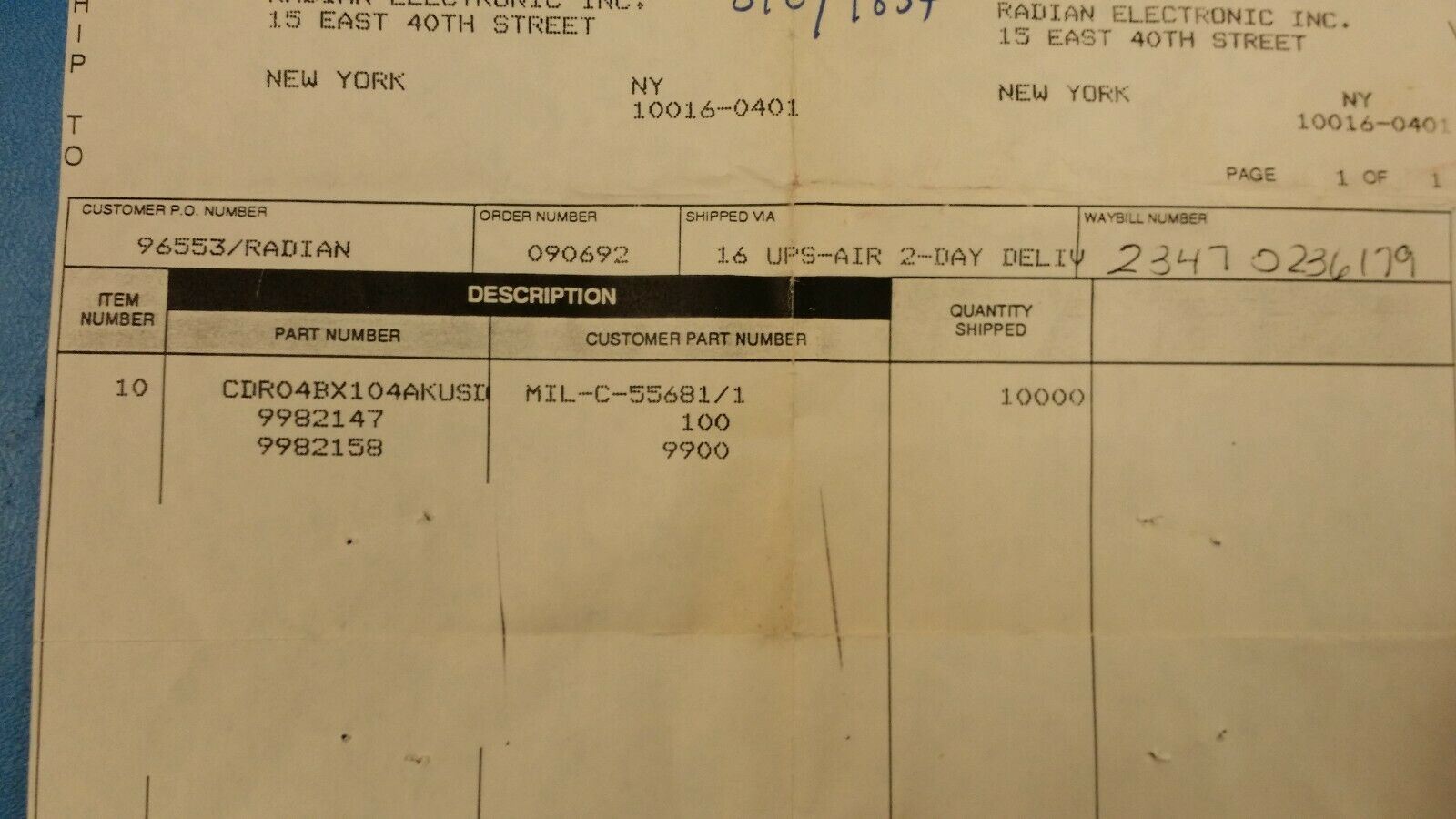 (100 PCS) CDR04BX104AKUSD Multilayer Cer Cap 0.1uF 50V 10% 125 CEL SMD 1812