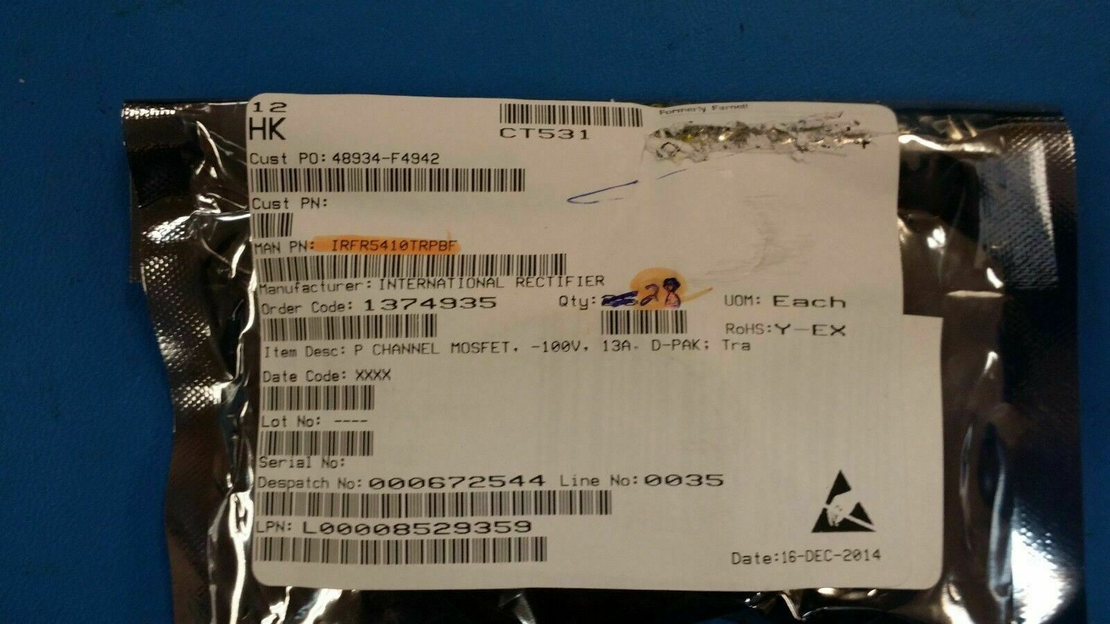 (13 PCS) IRFR5410TRPBF, IR, MOSFET, P-Channel, 100V, 13A, DPAK,